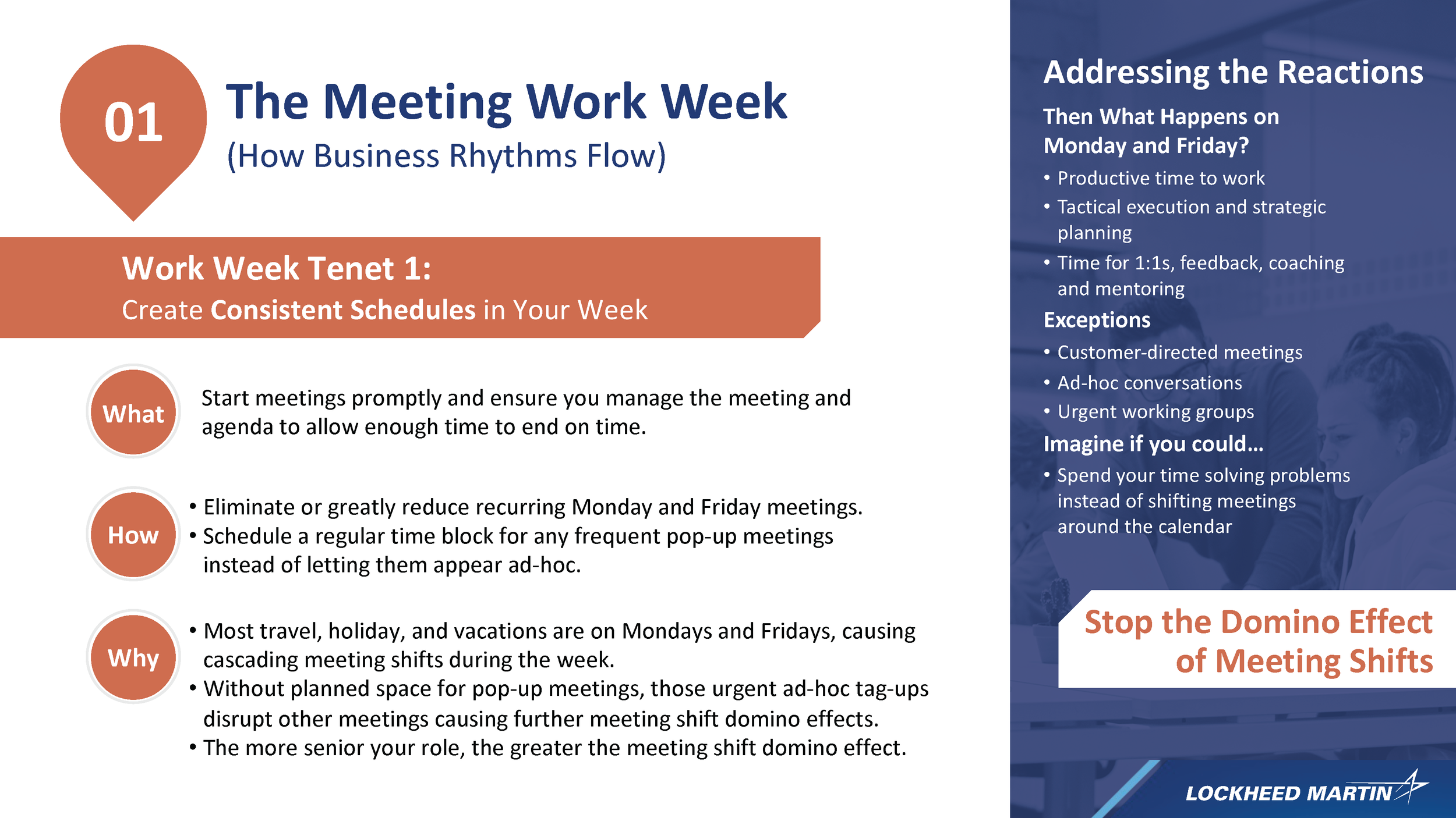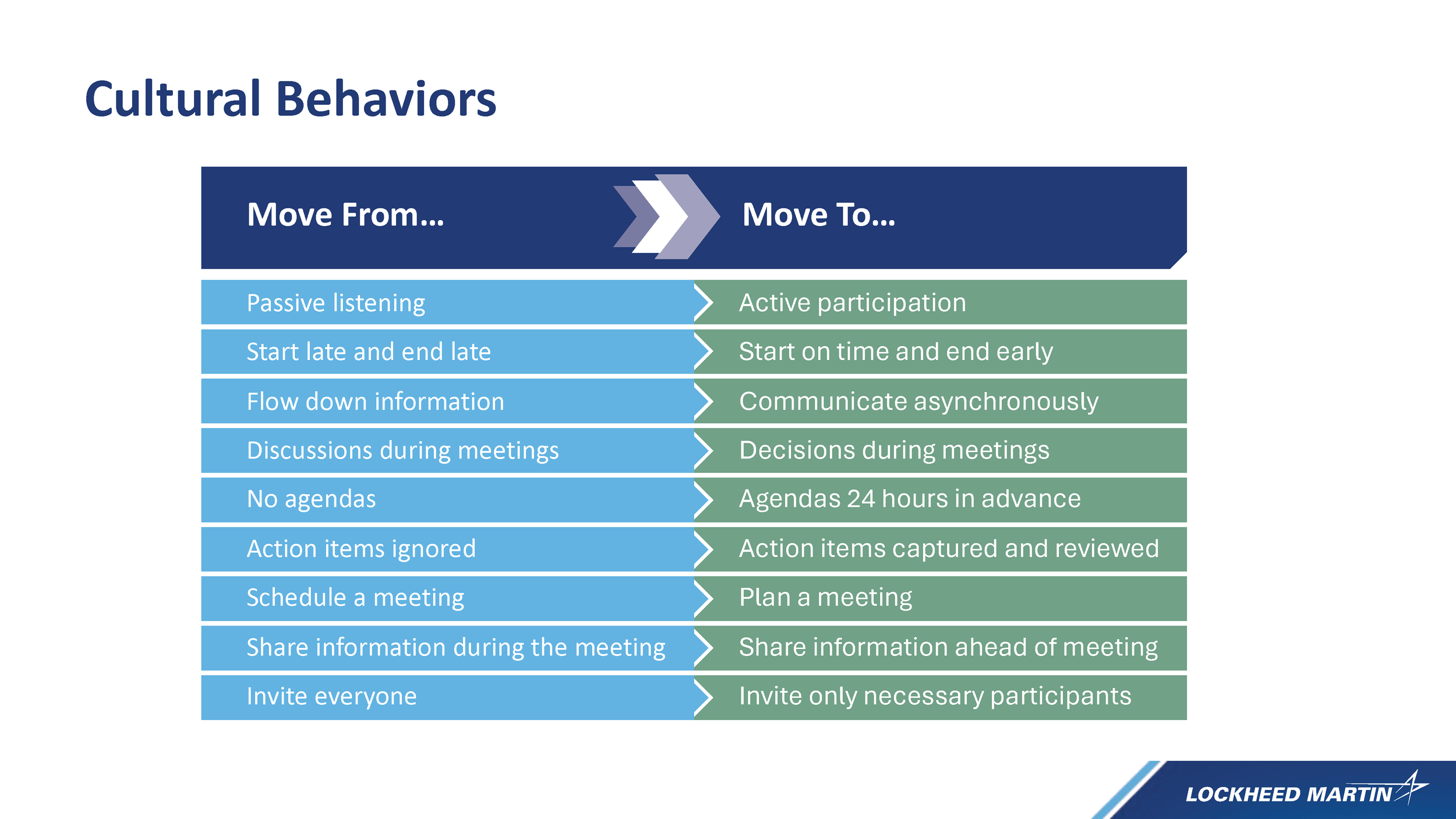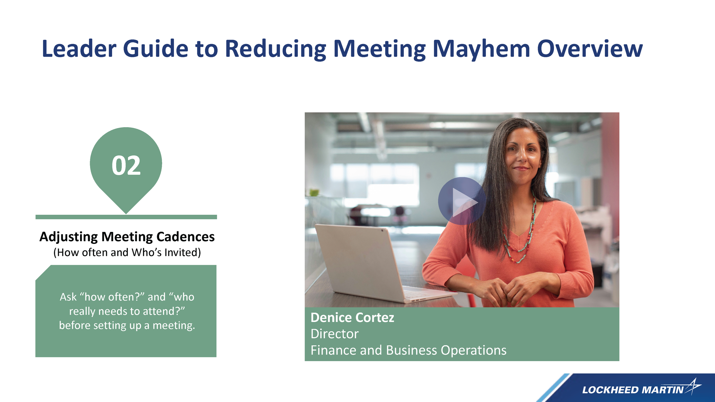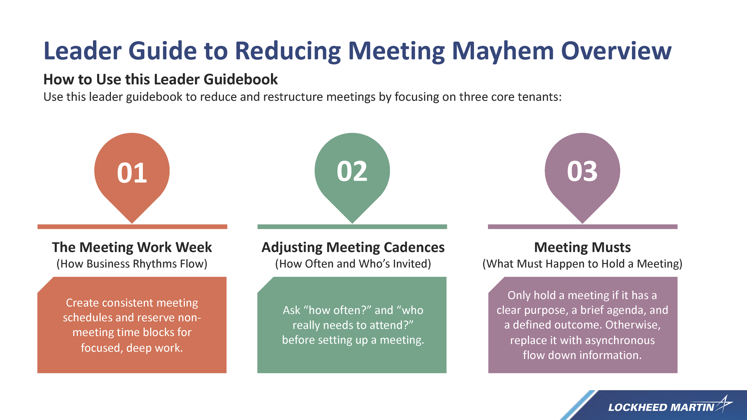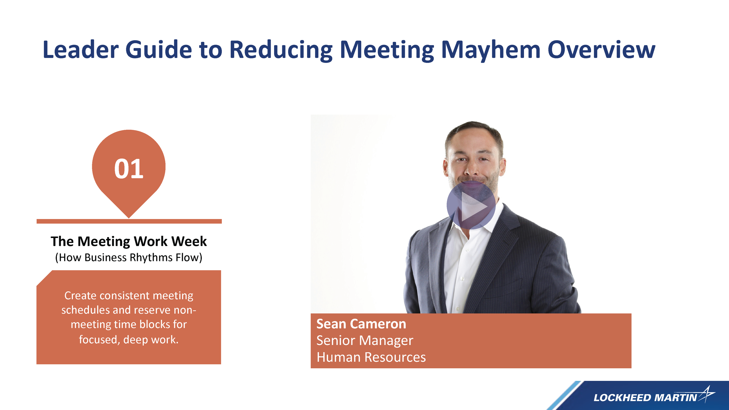 I created a comprehensive, executive-level PowerPoint presentation for Lockheed Martin to standardize their internal meeting protocols. Starting with a rough draft, I immediately applied their existing brand guidelines, managing the entire workflow (storyboarding and strategic content breakdown) to deliver a polished, authoritative presentation that helps the company turn complex technical information into clear, decisive action.