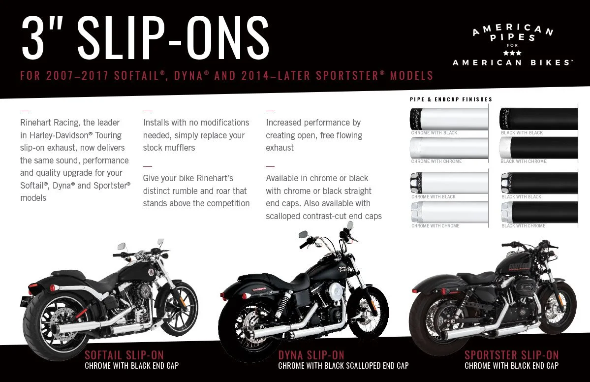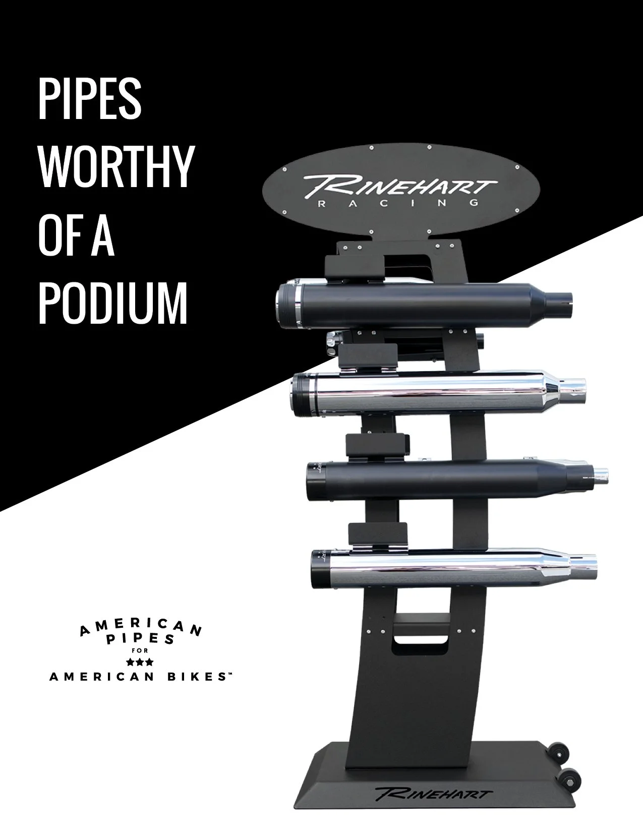 American Pipes for American Bikes. Rinehart Racing was looking to install this display in Harley Davidsion and Indian Motorcycle dealer showrooms across the country. The display would house take away cards that the customer could use to decide which slip on or end cap would best suit their particular motorcycle.